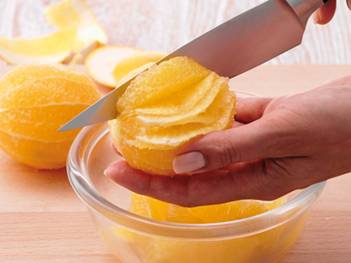 Zum Herstellen feiner Orangenfilets eignet sich – der Name sagt es schon – am besten ein Filiermesser. Seine flexible Klinge passt sich der Rundung der Orange an und ermöglicht ein exaktes Arbeiten beim Filetieren, so dass möglichst wenig Fruchtfleisch verloren geht.