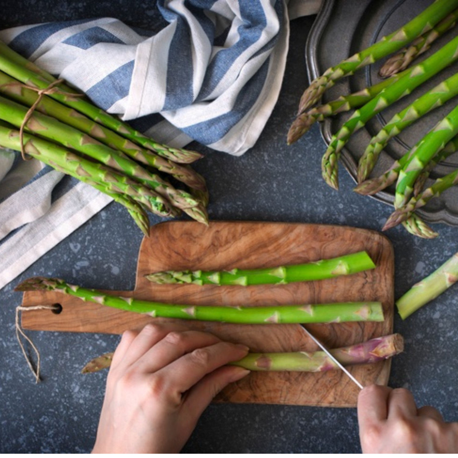 - Zuerst wird der Spargel gewaschen und trocken getupft. So werden die Spitzen von eventuellen Sandresten befreit.