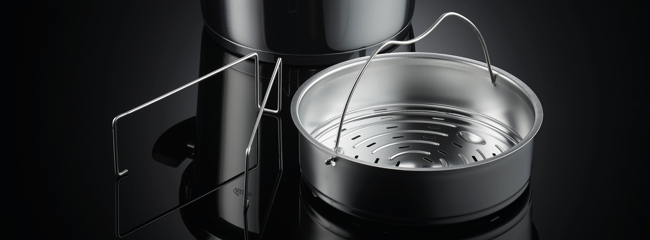 Fissler offers high-quality steamer inserts for pots in various sizes. The inserts are made of high-quality, heat-resistant 18/10 stainless steel.