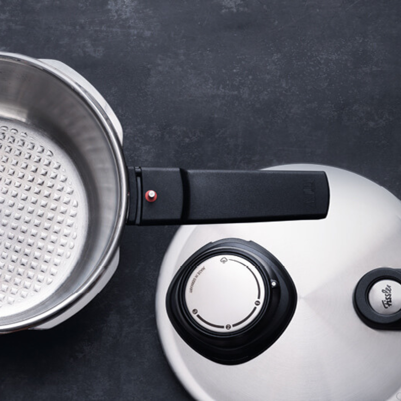 Steam release function on the handle for easy pressure regulation.