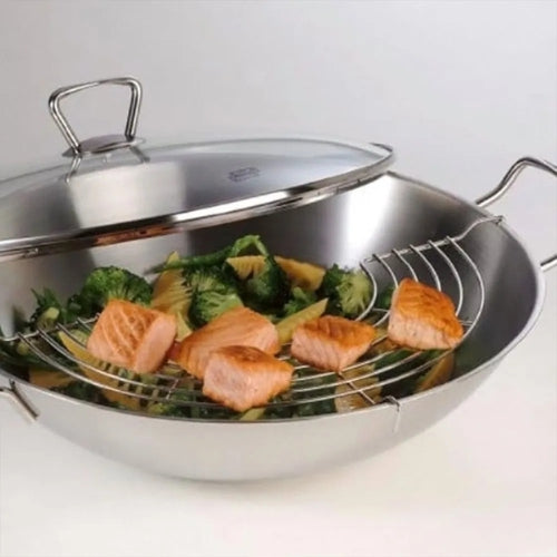 The high-quality, rust-free stainless steel draining rack serves as a shelf for fried foods and keeps them warm during cooking. And even when things get hot on the stovetop, the large metal handles of the Fissler Nanjing wok remain cool to the touch and provide a secure grip while cooking, frying, and deep-frying.